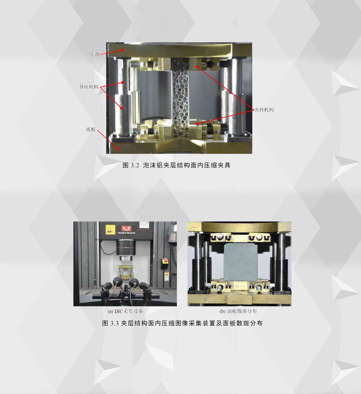 本章泡沫鋁夾層結構面內壓縮試驗所用到的實驗加載機器為INSTRON5894萬能試驗機,以恒定壓縮加載速率1mm/min作用在壓盤上??紤]到過大的加載位移可能超出夾層結構的承載能力,對其過大的變形研究意義不大,因此本章分析所有試件的極限加載位移的設定為5.5mm。為了獲得芯層泡沫鋁的破壞形式和面板的屈曲過程,對其側面(即圖3.2所示試件位置)進行圖像采集;與此同時,采用數字圖像相關技術(DIC)測量夾層結構面板的變形量,如圖3.3所示(a),根據DIC技術采集原理,在開始面內壓縮試驗之前需要對夾層結構面板表面噴涂啞光白漆作為底漆,等待底漆晾干之后再噴啞光黑漆,形成可以被DIC采集設備識別的散斑,面板處理之后散斑分布效果如圖3.3(b)所示。