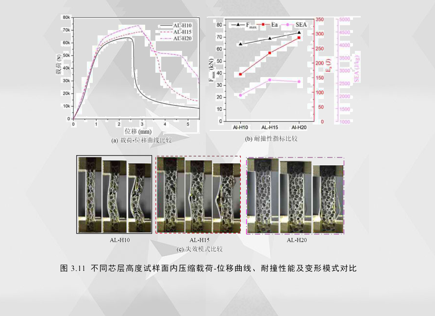 從其耐撞性指標圖3.11(b)中可以看出,鋁合金夾層結(jié)構(gòu)的峰值載荷及總吸能隨芯層高度的增加而增加,而其比吸能的變化趨勢則不然。當夾層結(jié)構(gòu)的芯層高度從10mm增加到15mm,試件在第三階段的主要失效模式由整體屈曲變?yōu)槊姘迩緦悠茐姆绞揭舶l(fā)生了變化,由于后者的失效模式吸收的能量比前者多很多,所以即使結(jié)構(gòu)的重量有所增加,但AL-H15的比吸能(SEA)仍比AL-H10高。而當夾層結(jié)構(gòu)的芯層厚度從15mm增加到20mm時,試件在第二、三階段的主要失效模式基本未發(fā)生變化,雖說后者在第三階段的吸能會更多一些,但畢竟總吸能提高的幅度有限,所以AL-H15比AL-H20的比吸能(SEA)更高。