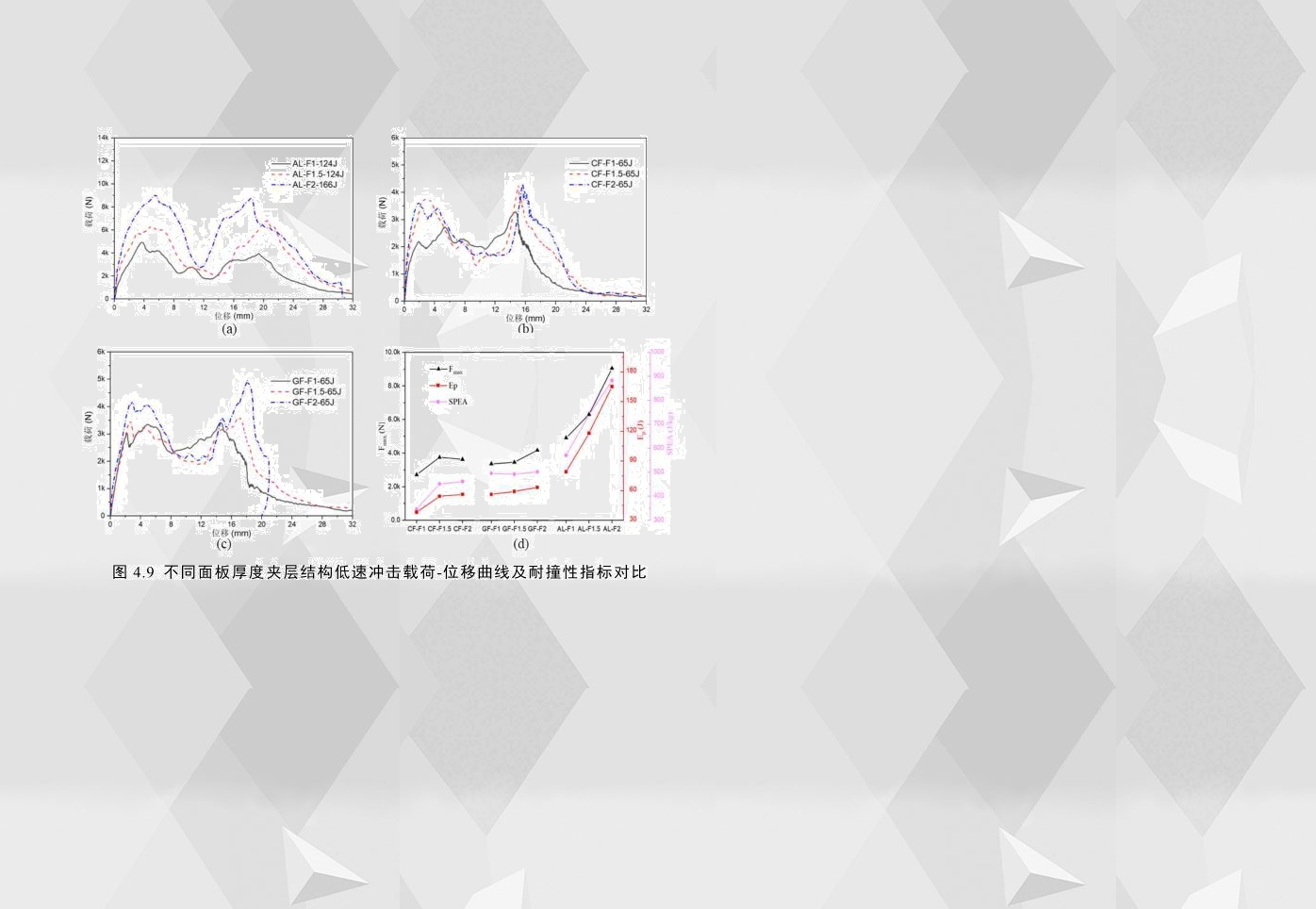 為了研究夾層結(jié)構(gòu)的面板厚度對沖擊性能的影響,圖4.9(a)-(c)比較了三種不同面板厚度的夾層結(jié)構(gòu)的載荷-位移曲線。無論是彈塑性面板還是脆性面板,夾層結(jié)構(gòu)的面板厚度對其低速沖擊響應(yīng)均有較大影響。為了更直觀地比較,圖4.9(d)對比了不同面板厚度夾層結(jié)構(gòu)的耐撞性指標(biāo),通過觀察,鋁合金夾層結(jié)構(gòu)的耐撞性能隨面板厚度增加而明顯增加,面板厚度從1mm增加到2mm,其初始峰值載荷、穿透吸能和比穿透吸能分別提高了84%108%54%;對玻璃纖維夾層結(jié)構(gòu)而言,當(dāng)面板厚度從1mm增加到2mm,其初始峰值載荷和穿透吸能分別只提高了24%13%,而面板厚度的增加對比穿透吸能的影響效果差異不大;而對碳纖維夾層結(jié)構(gòu)而言,當(dāng)面板厚度從1mm增加到2mm,其穿透吸能和比穿透能分別提高了42%33%,并且隨著層數(shù)的增加,耐撞性指標(biāo)增加的幅度大幅減小。